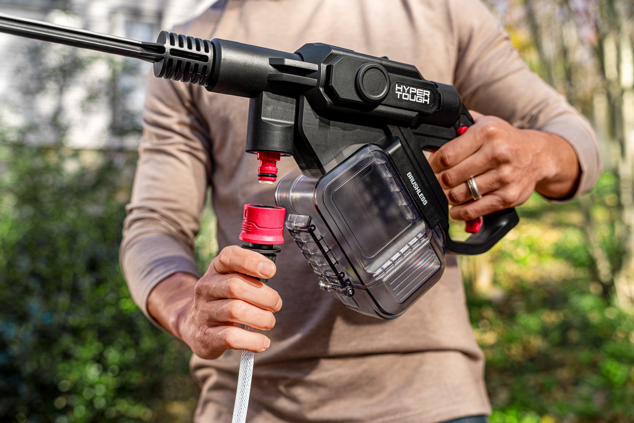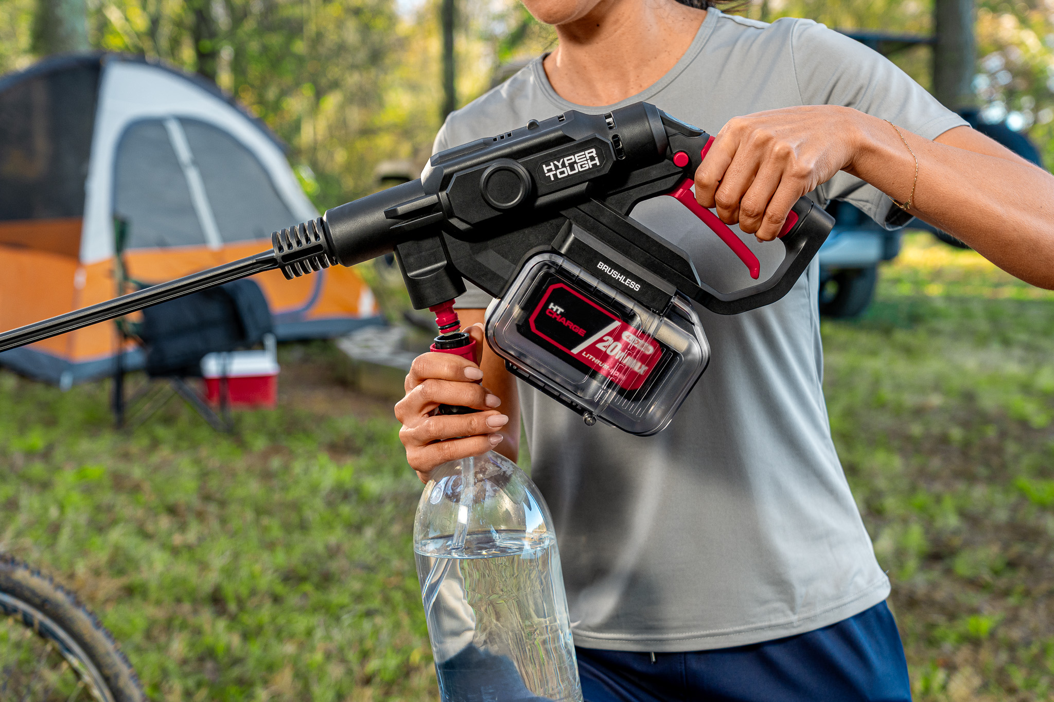 At the core of the messaging was portability: a 20-volt cordless system capable of drawing water from traditional hoses, buckets, or even 2L bottles. This flexibility allowed us to build a variety of real-world scenarios that visually reinforced the product’s versatility — from vehicle cleaning and home exterior maintenance to outdoor recreation.